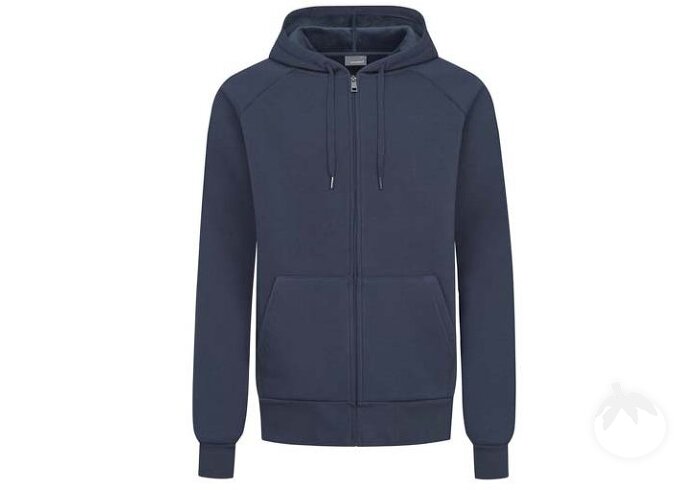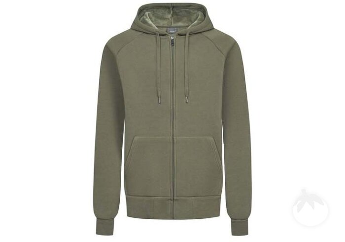 Heavy molton mixed fabric raglan hooded sweatjacket with soft velvet fabric inside, elastane sleeve cuffs and waistband as well as a pouch pocket, full-length and concealed tone-in-tone zipper, produced of long staple combed cotton and polyester. The hooded sweatjacket has a young, modern cut.